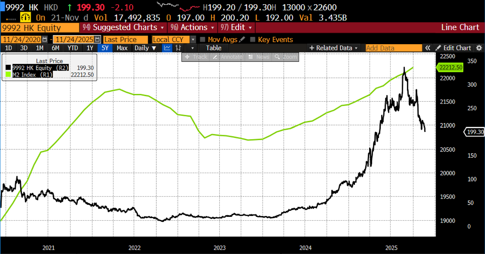 Pop Mart stock price (9992 Hong Kong) and US Money Supply M2, 2000 – present
